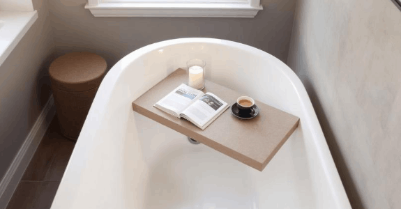 A versatile and elegant caddy designed to sit across the bathtub. Made from composite stone resin for durability and a natural stone feel. Provides a stable surface for books, candles, or a cup of tea. Its neutral tone complements various bathroom styles.