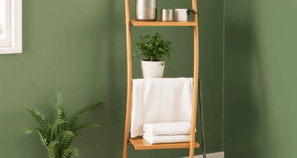 A space-saving vertical storage solution with a modern rustic appeal. Features treated bamboo shelves on a powder-coated steel frame. Perfect for hanging towels and displaying bathroom plants or decorative items. Easily movable to suit your changing needs.