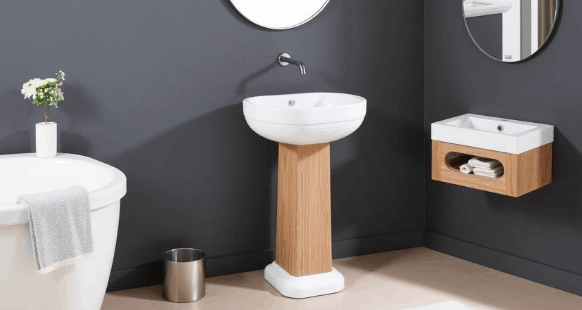 A classic pedestal design updated with a textured ceramic bowl and solid oak leg. This piece adds character and a touch of organic texture to smaller bathrooms. The compact footprint makes it an ideal choice for optimizing limited space. Its timeless design ensures it remains stylish for years.
